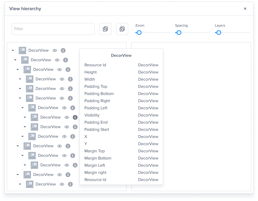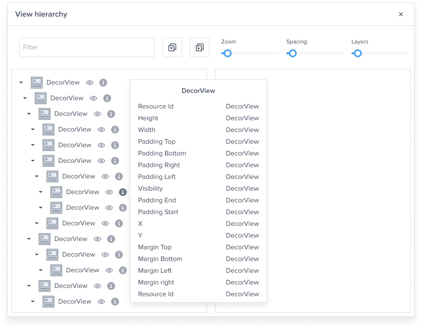 This feature is critical for investigating UI bugs as it makes the process of finding the problem and fixing it faster and simpler. For example, if you receive a report that a certain UI view is missing, you can use View Hierarchy to easily discover if the missing view is hidden behind a higher layer, out of the parent view's bounds, or missing from the window.