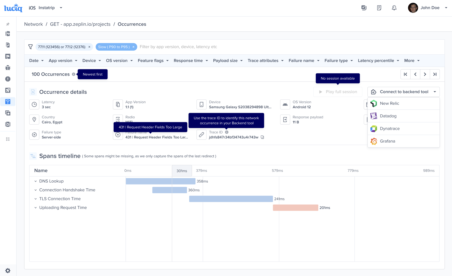 The new Luciq integration with Grafana enables end-to-end tracing for network calls, connecting client-side and server-side monitoring for your network requests. By using a unique trace ID, you can follow any network request from the client to the server, providing insights for troubleshooting networking issues.