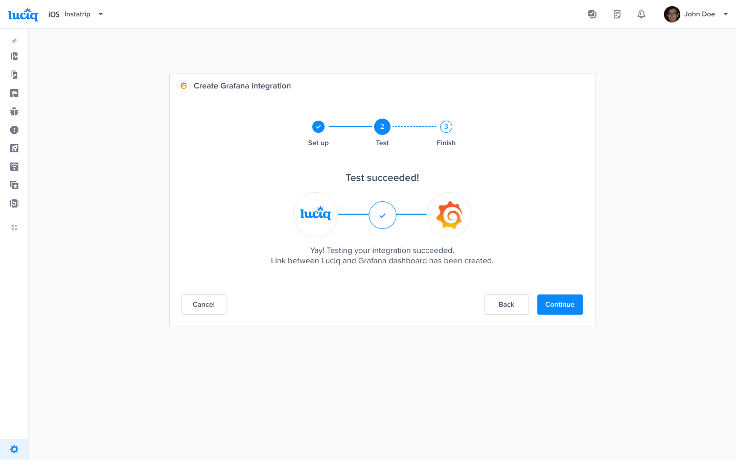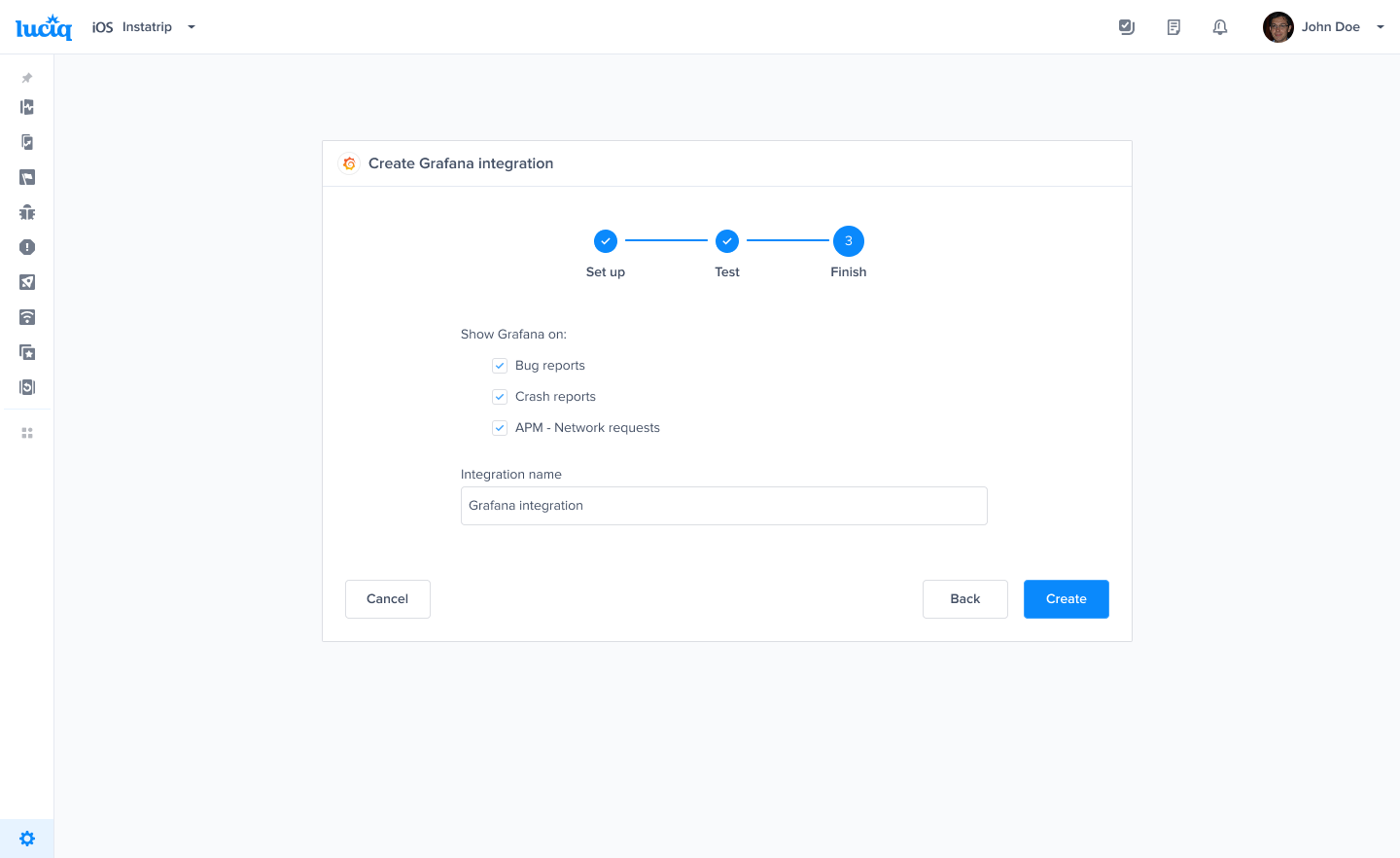 To create a Grafana Integration go to Settings -> Integrations -> Grafana in your Luciq dashboard.