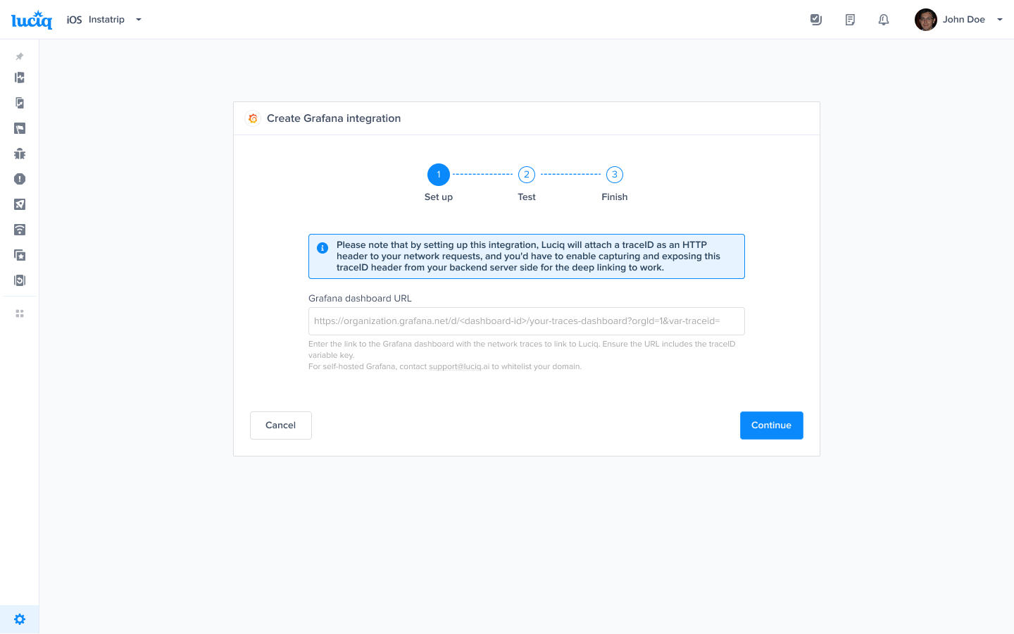 By setting up this integration, Luciq will attach a trace ID as an HTTP header to your network requests. This allows us to link network requests from Luciq to Grafana.