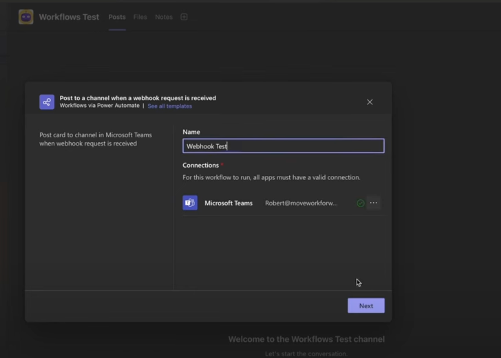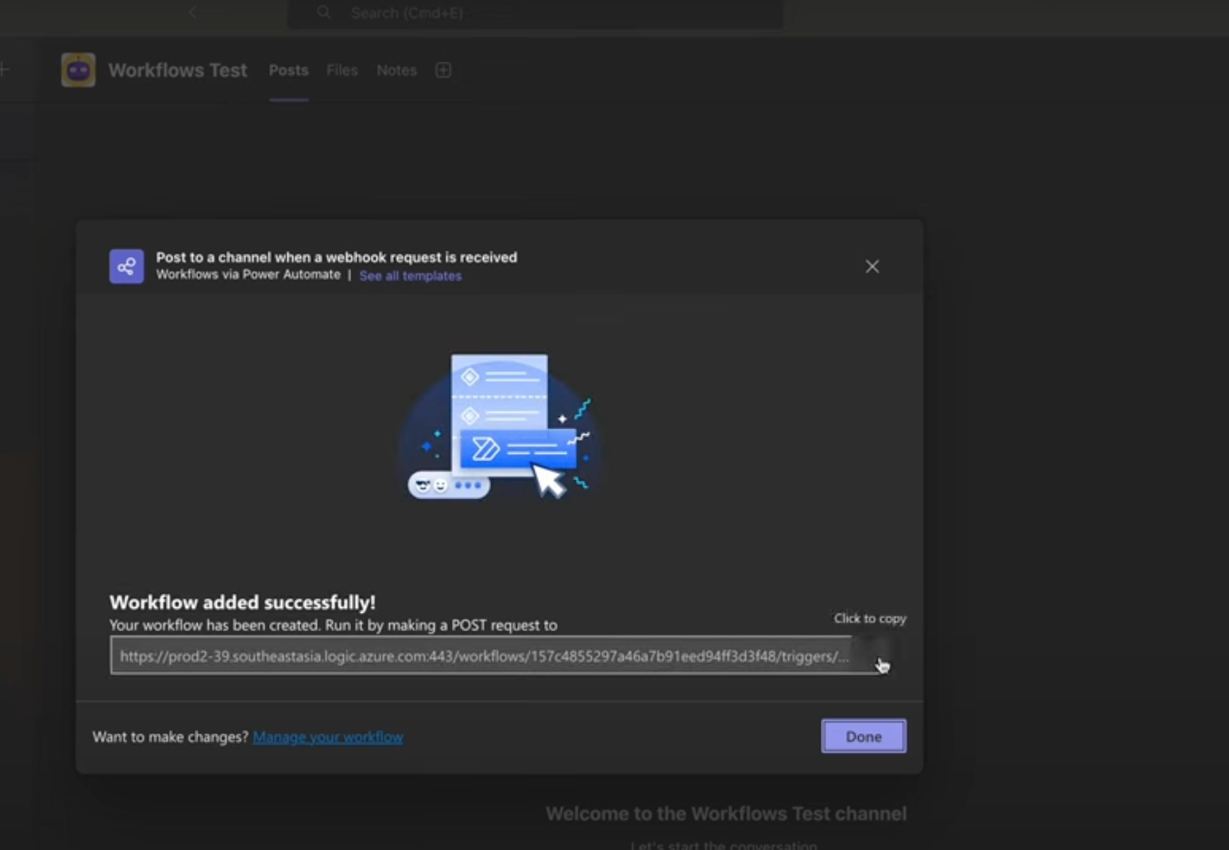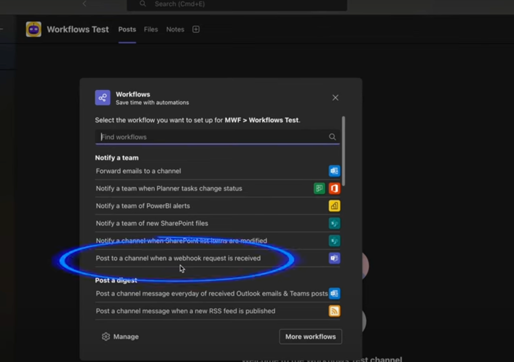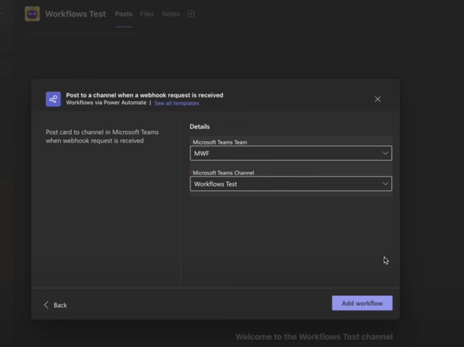 Select the team and channel, then confirm by clicking “Add workflow”.