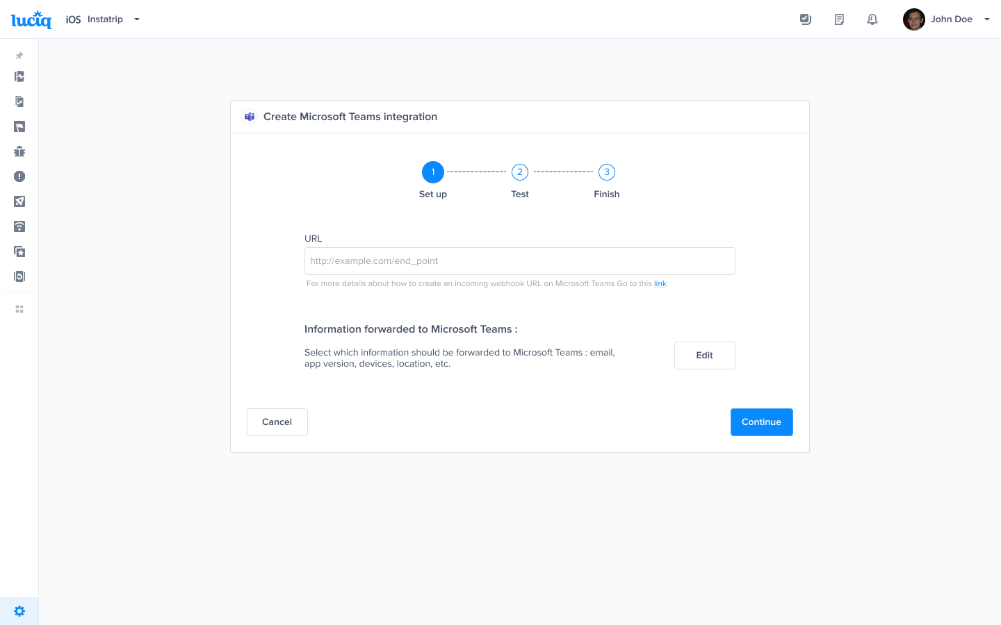 Go to the integrations page on your Luciq dashboard and select 'Microsoft Teams' to set up the integration. You will be prompted for the webhook URL we generated in Microsoft Teams.