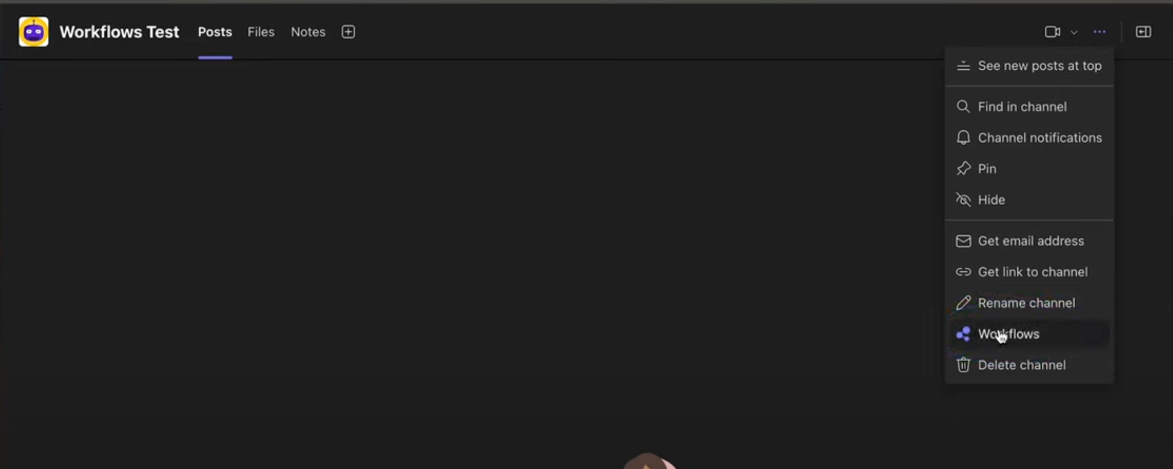 Open Microsoft Teams and select the channel you would like to receive an Luciq notification on. From the three-dot menu on the top right, select Workflows.