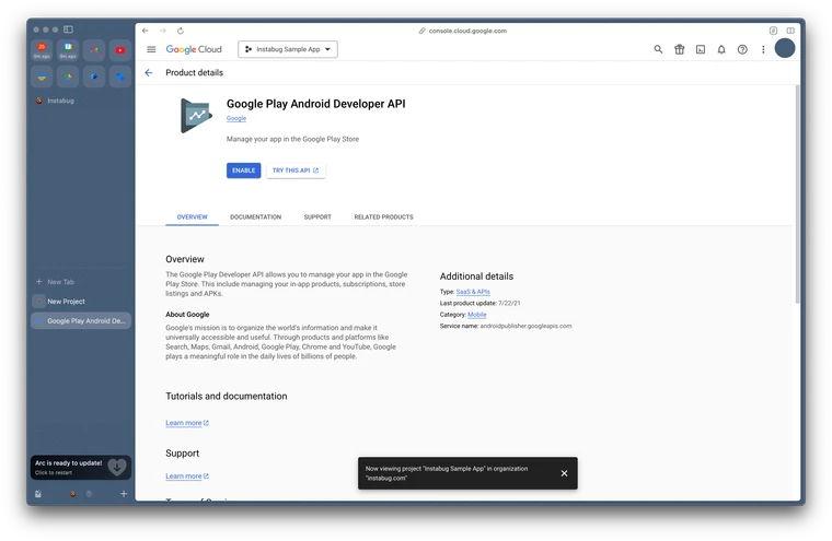 Go to the Google Play Developer API page in Google Cloud Console.