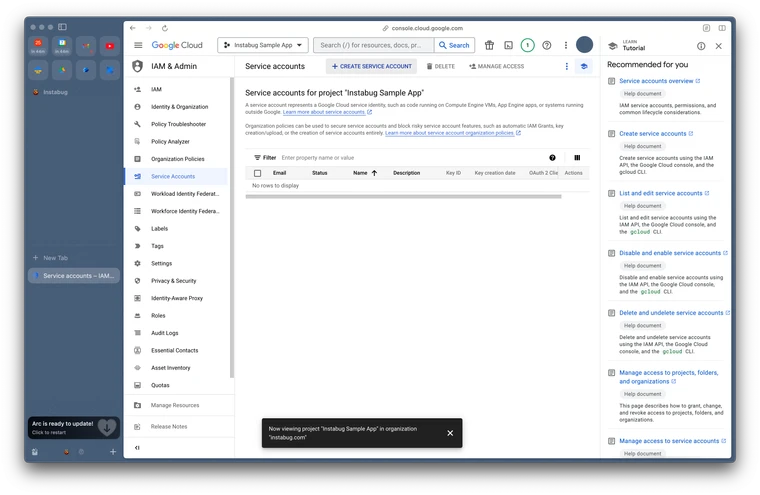 In the Google Cloud Console, go to Service Accounts