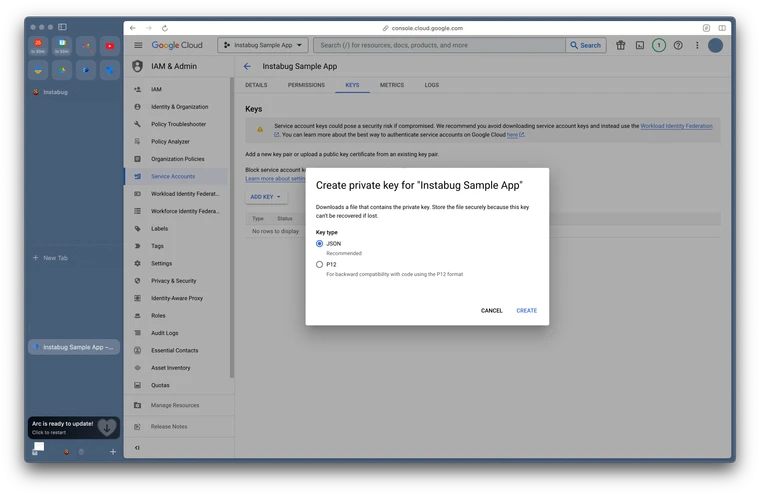 Download Service account key file: Your service account key file should start downloading; you’ll need to upload that key on our dashboard.