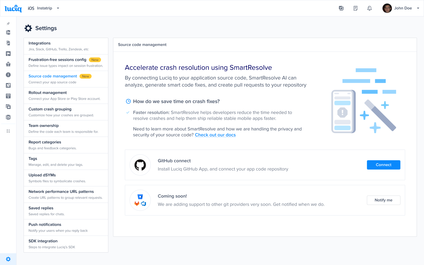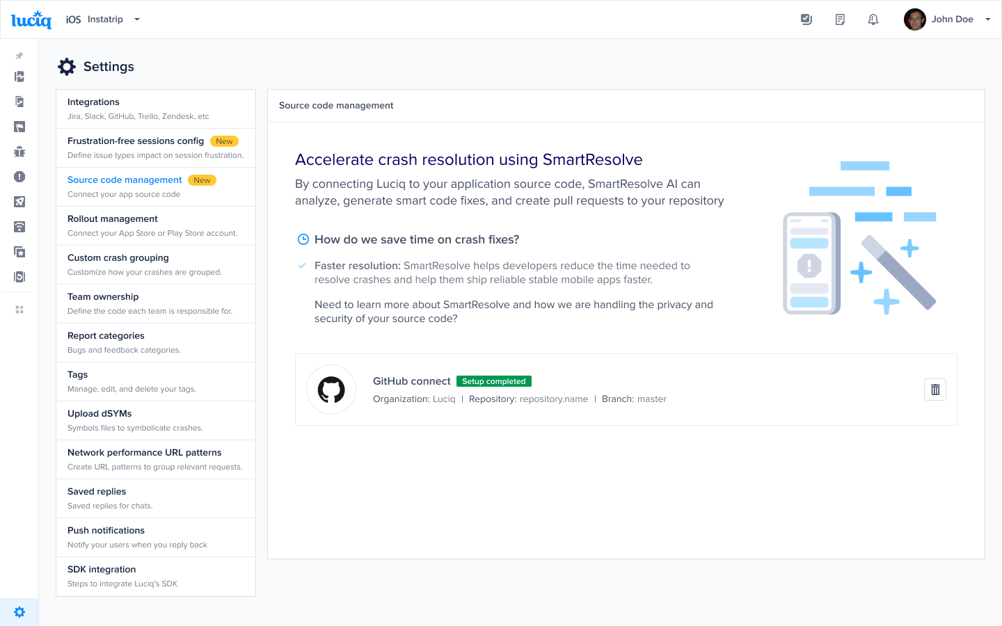 Resolve Agent is an AI-powered feature designed to help developers quickly resolve app crashes by automating root cause analysis, code fix generation, and pull request creation. To enable SmartResolve, you need to connect your source code repository to Luciq using the Luciq CodeLink GitHub app. This guide walks you through the steps to complete the connection and start using Resolve Agent.