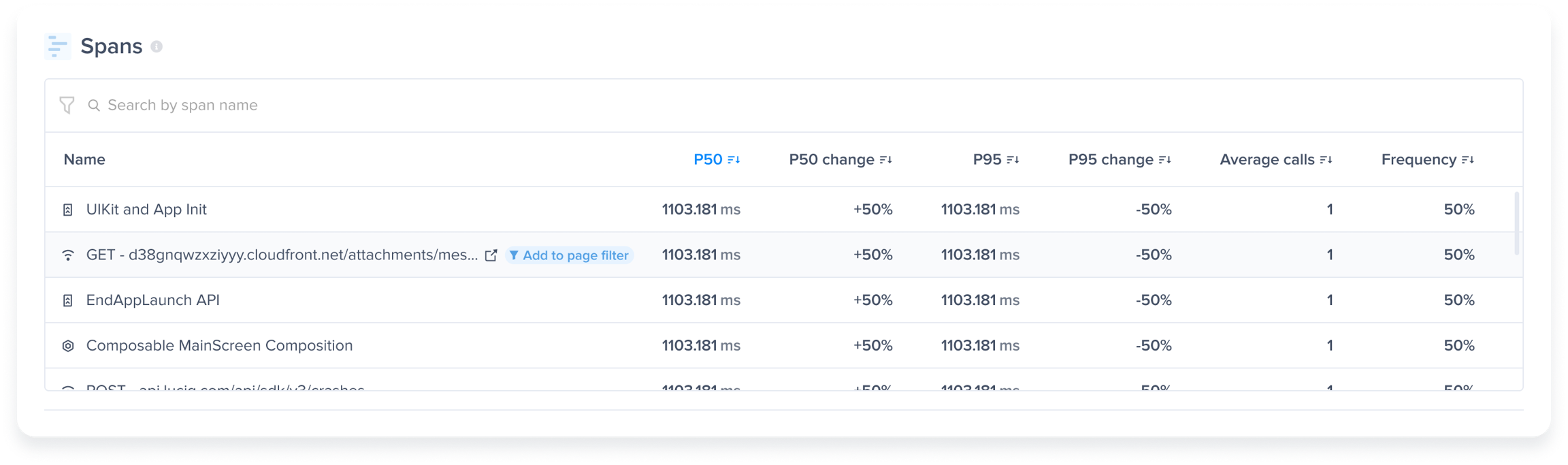 This shows the change rate of P50 & P95 durations in comparison to the last period based on the selected date filter.