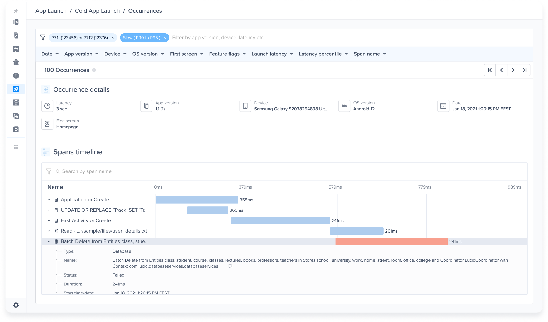 Spans allow you to better understand the root causes of the latencies that occur during your app’s launch and screen loading. This section provides a detailed breakdown of the duration of the platform life cycle stages, network calls, and more information during the app launch and screen loading.