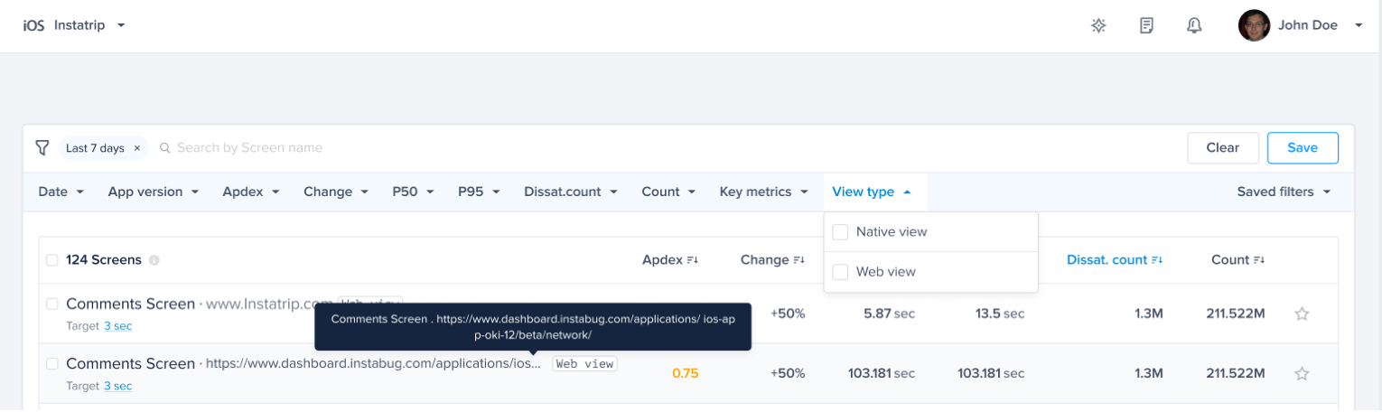 Luciq automatically captures the time it takes for your WebViews to load. This includes both the time to load the native screen that hosts the WebView and the time it takes the WebView itself to load, along with its content.