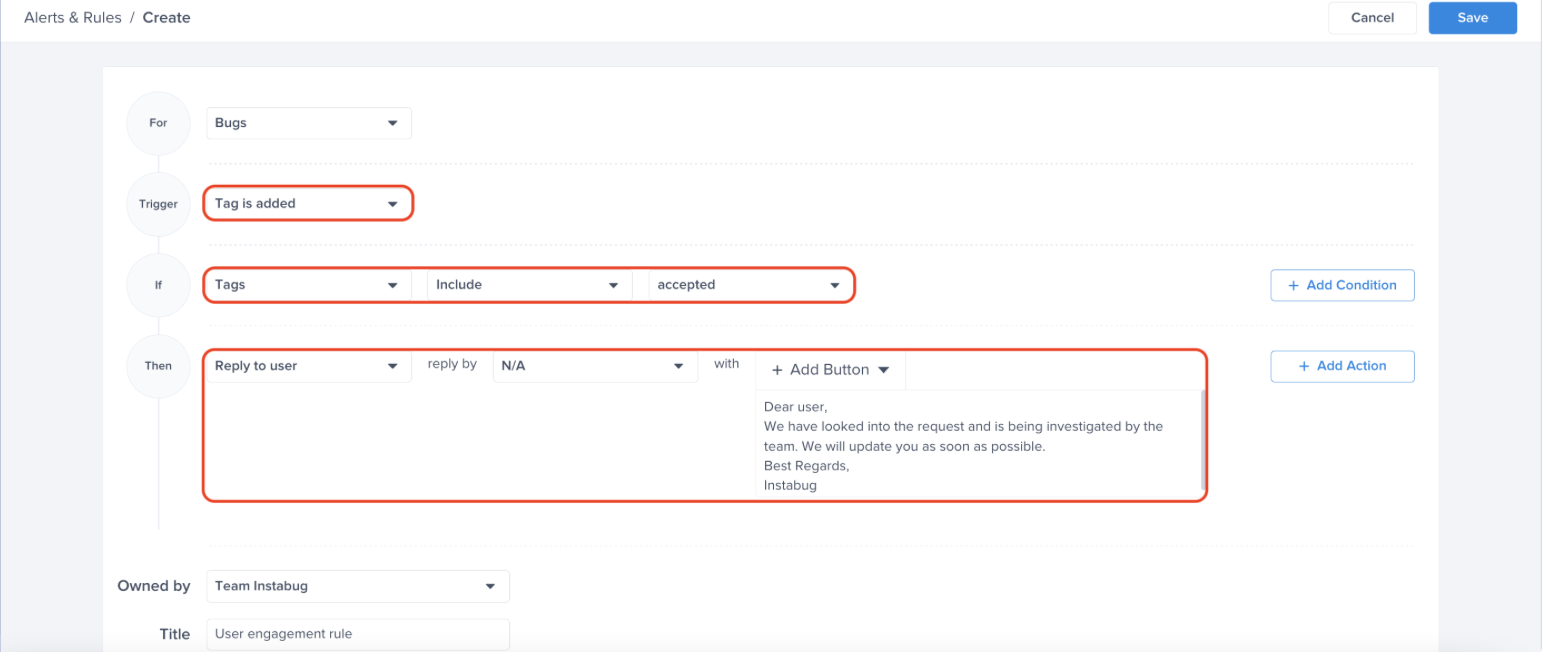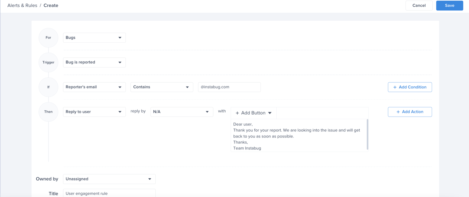 The below rule example is going to evaluate each bug report against the specified conditions, if they’re met then the bug will be forwarded to the Jira project, change the report status to in-progress and send an automated reply to the user.