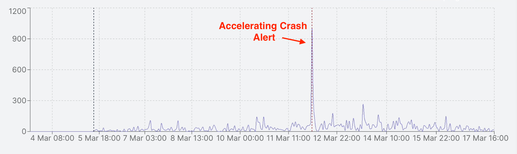 In this graph, you can see a crash occurrence that suddenly spikes. Luciq detects this rapid increase and triggers the accelerating crash alert.