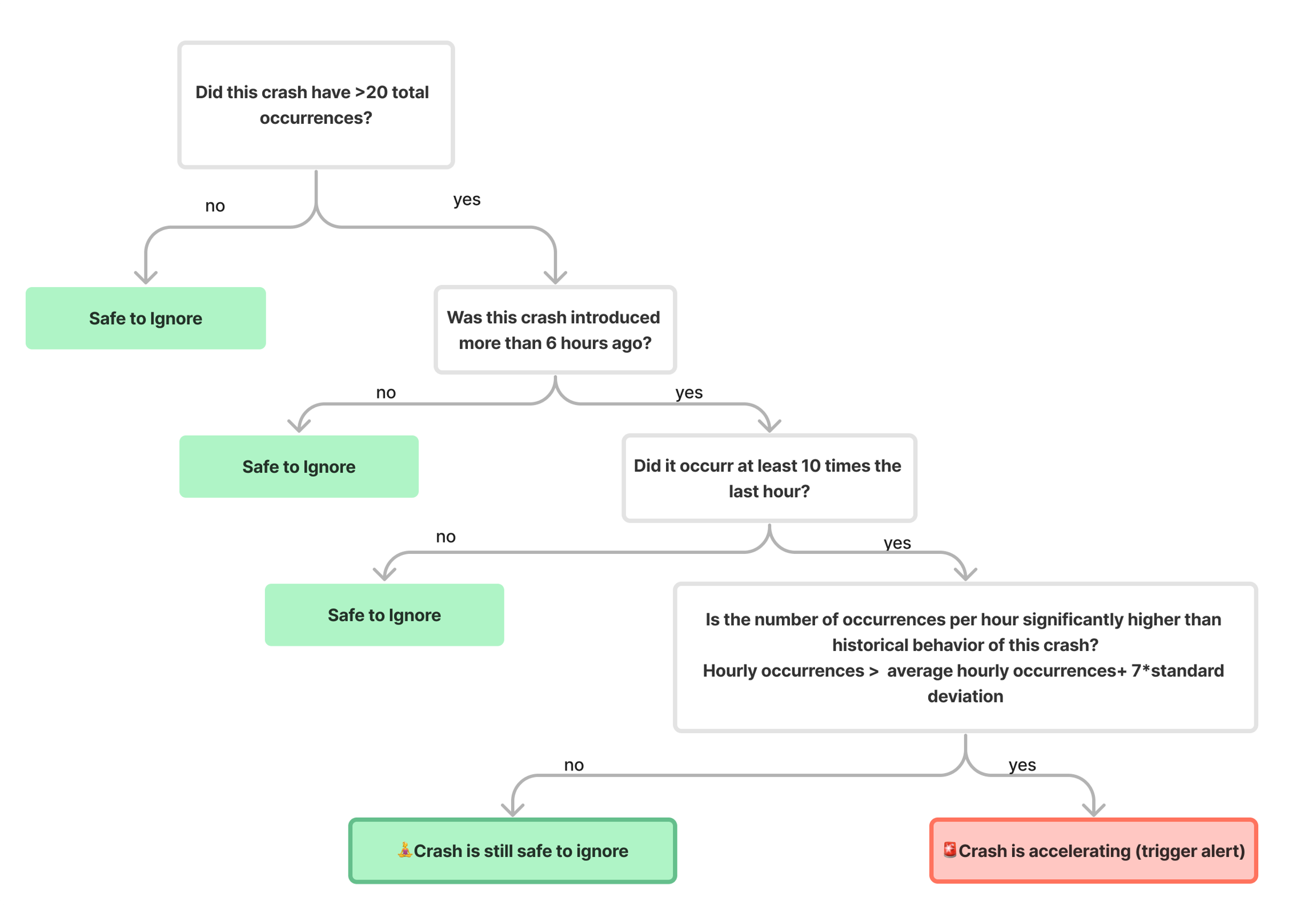 We run an algorithm on incoming crashes to analyze crash patterns and identify accelerations. We do so by comparing the occurrence of each particular crash against its historical average, determining whether there is a significant increase. The decision-making process is outlined in the flow chart below: