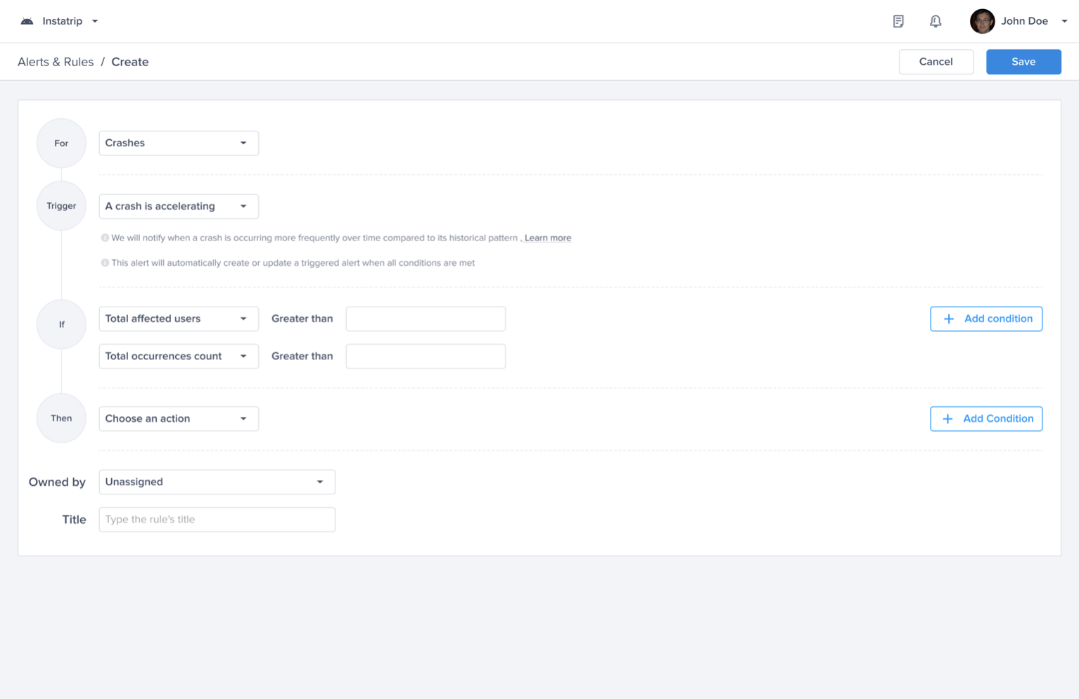 Luciq's new automatic detection of accelerating crashes alert type allows you to safely ignore non-critical crashes by notifying you only when a crash starts accelerating. This feature ensures that you can focus on significant crashes that require immediate attention without being overwhelmed by sporadic, non-critical crashes.