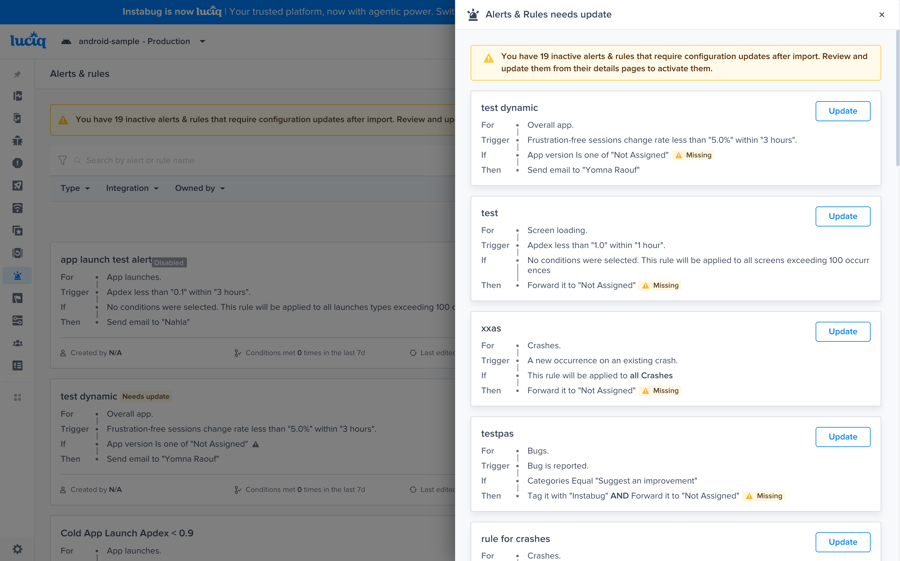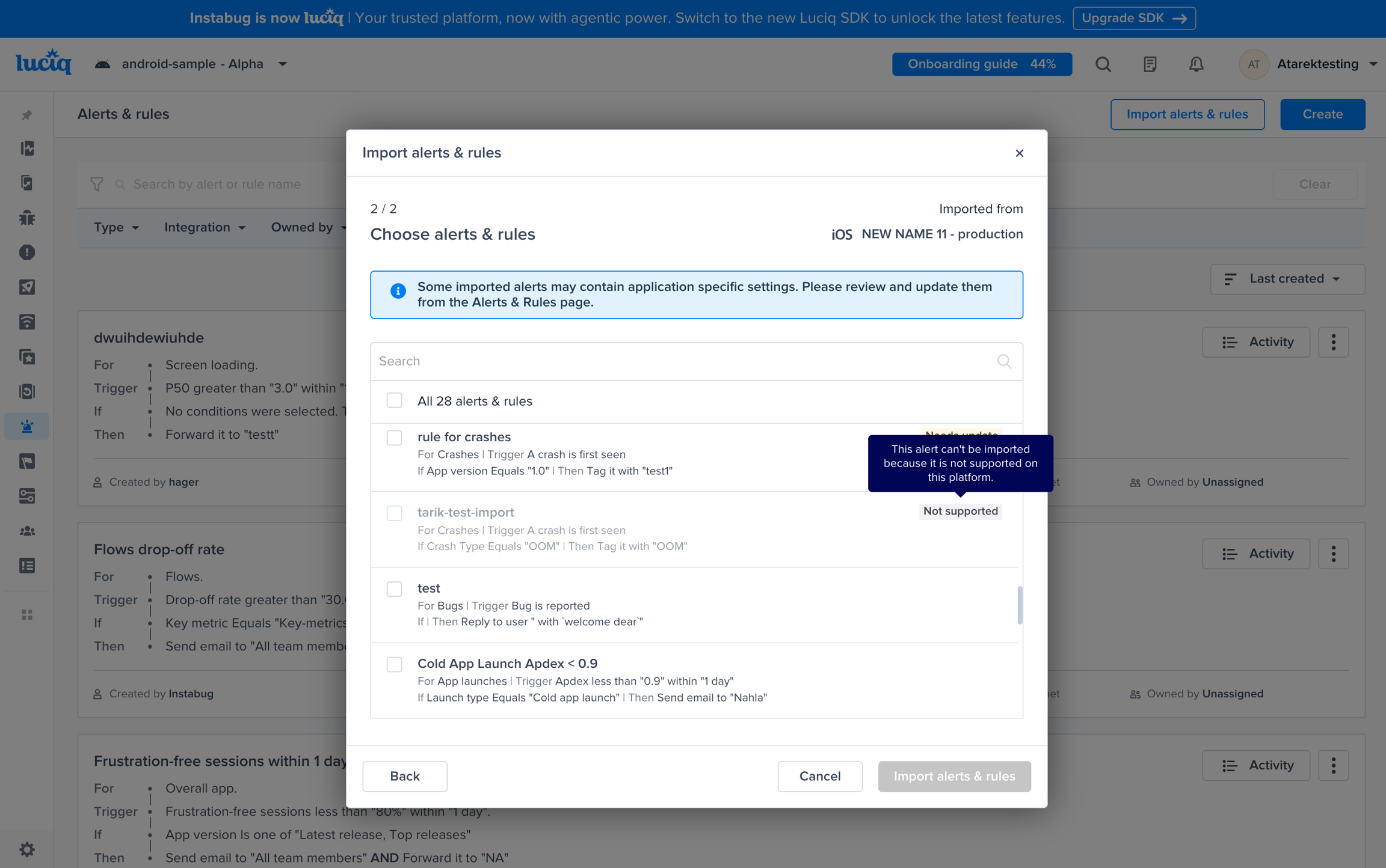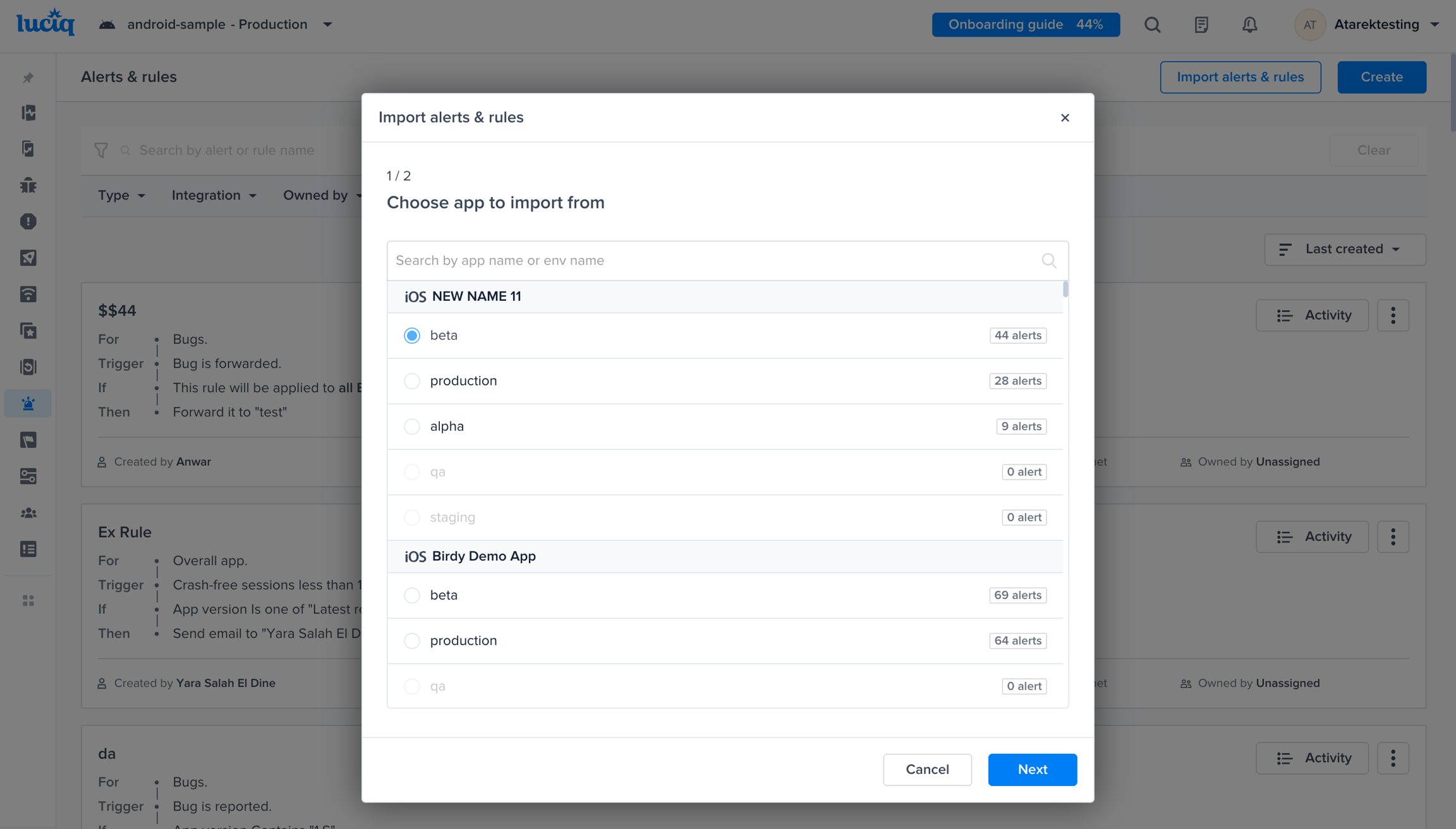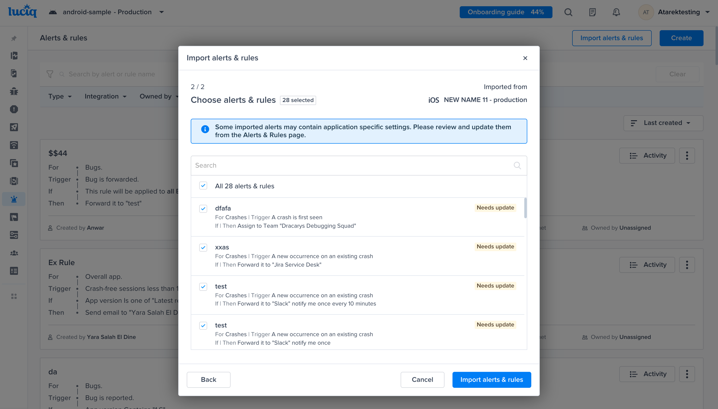 Luciq enables you to seamlessly reuse existing alerts and rules across your applications and environments on Luciq. This feature helps you: