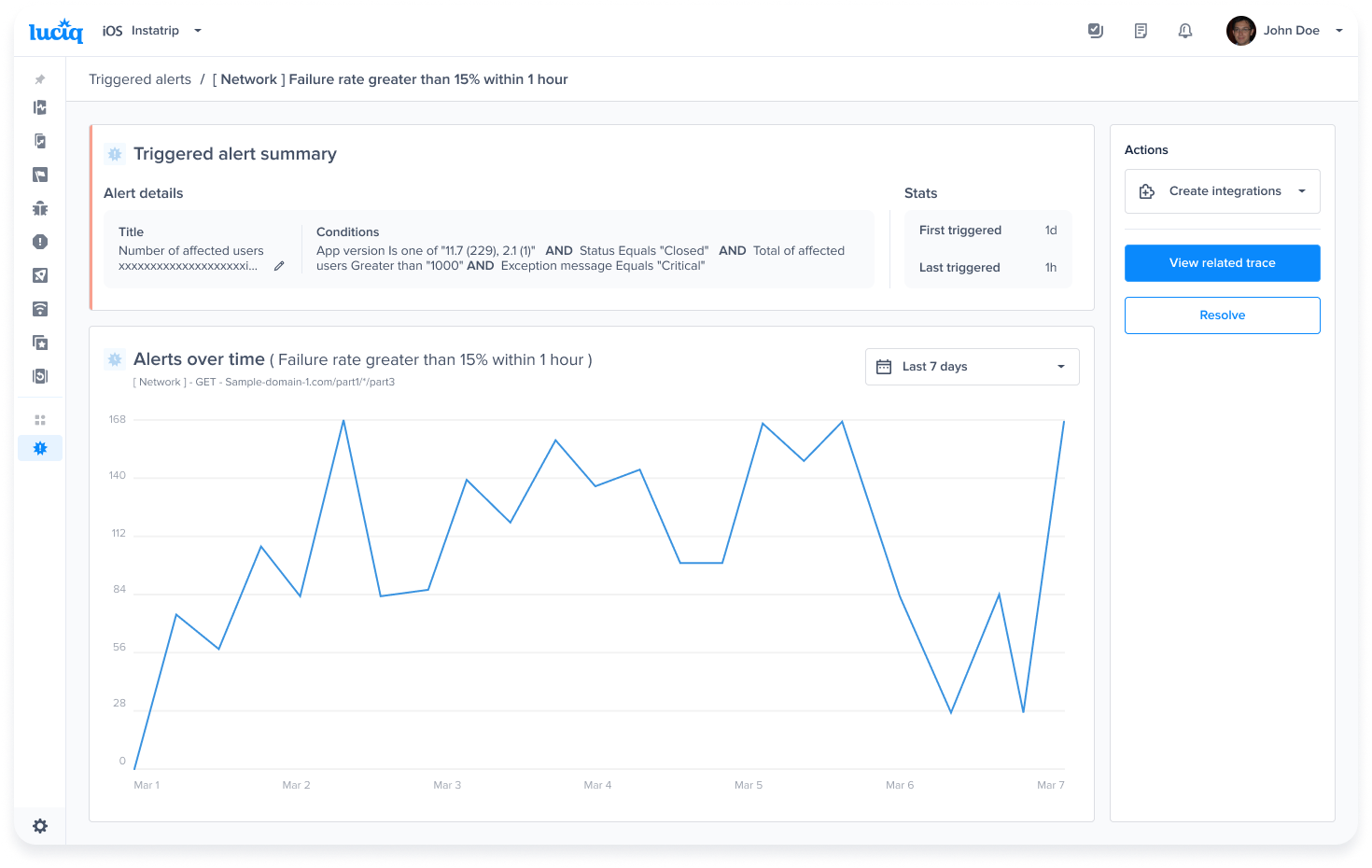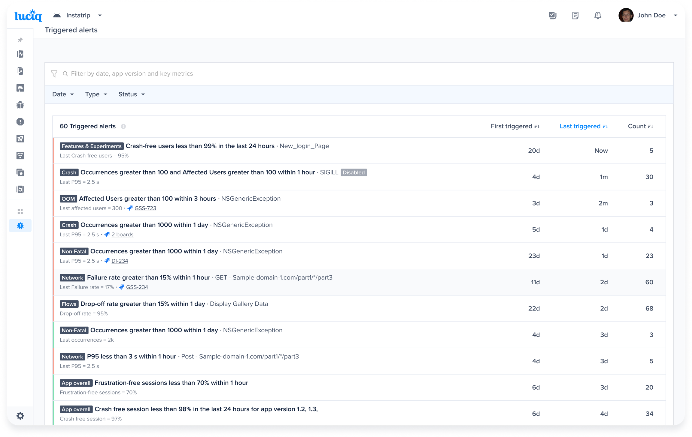 Luciq Crash Reporting and App Performance Monitoring automatically create a triggered alert report whenever any of your alerts generated from Luciq for overall app, crashes, app launch, screen loading, network, execution traces, or UI hangs are triggered.