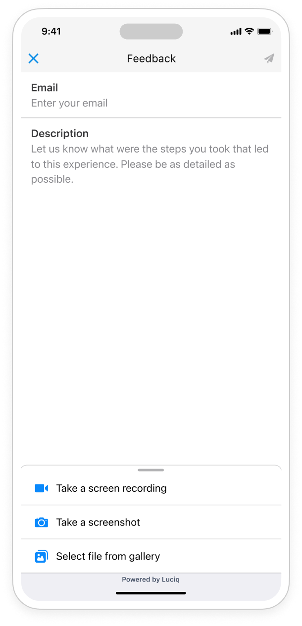 If enabled, users will first see a modal asking if they want to report this experience. If their answer is yes, they will see a Feedback description model that allows them to enter their email and describe their experience using their own words.