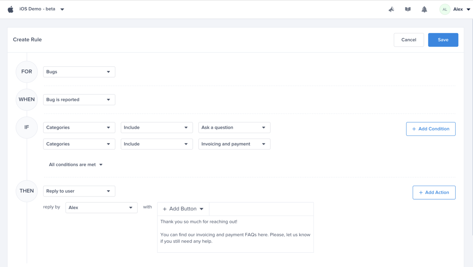 It's never guaranteed that your team will be able to reply back to all the users and their reports on the spot. Instead of making them wait, reply back to them with a content relevant to the problem or issue they reported. You can set an automatic reply and customize the content based on the category they picked before sending the report. This is easily done through the alert & rules.
