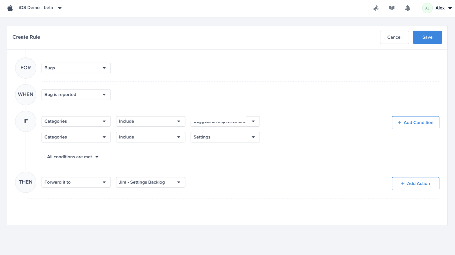 In your rules and filters, you can combine more than one condition together to make sure your logic applies to the reports coming from a specific path of selection. For example, you may want to forward the "Newsfeed bugs" to a different Jira project than the "Newsfeed improvements".