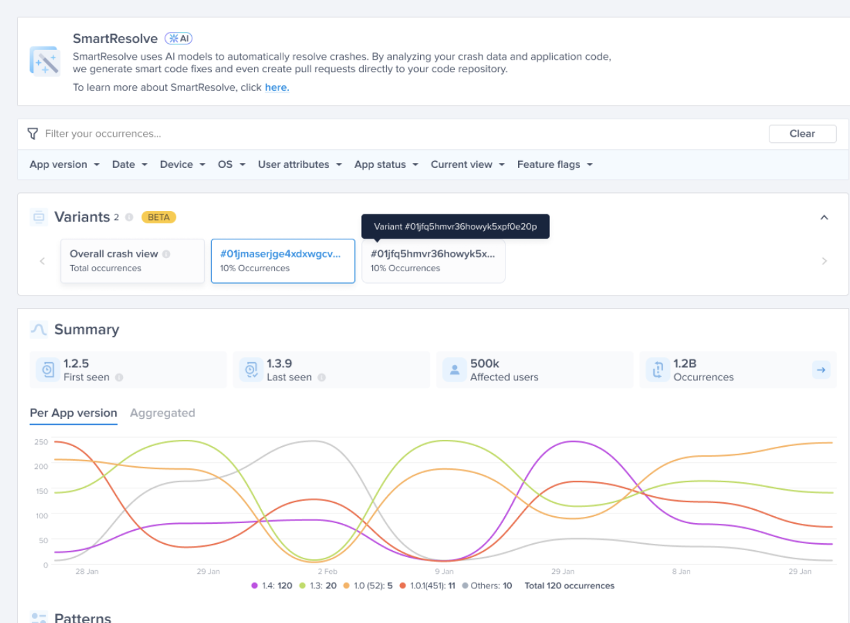 Crash Variants highlight the different stacktrace paths within a single crash group. Instead of showing only one representative stacktrace per app version, Variants let you see all the distinct execution paths that can trigger the same crash. This helps your team uncover edge cases and debug faster.