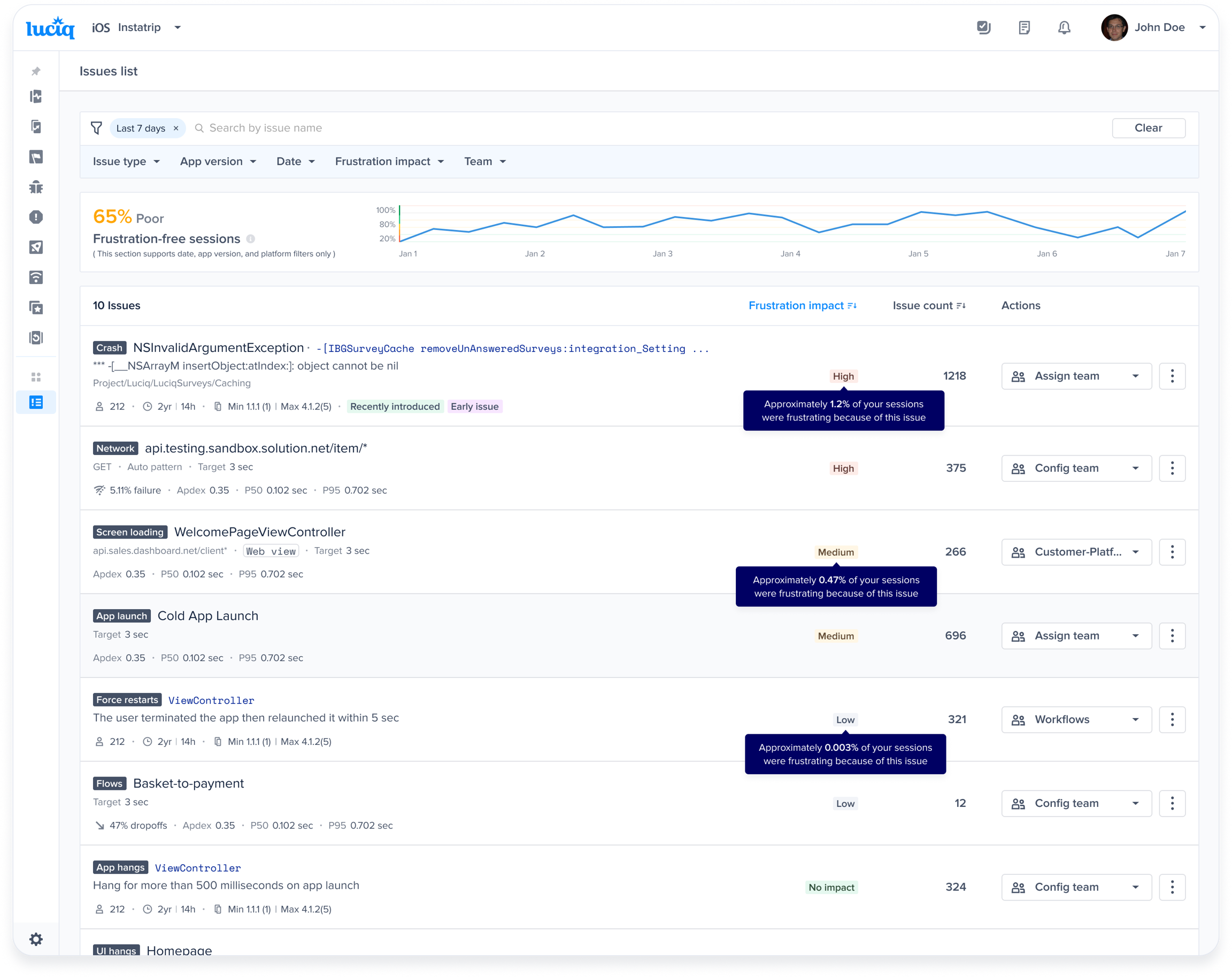 The Frustration Impact of an issue reflects its effect on your app's frustration-free sessions by estimating the percentage of frustrating or tolerable sessions it causes.