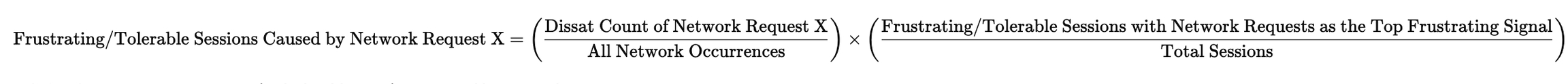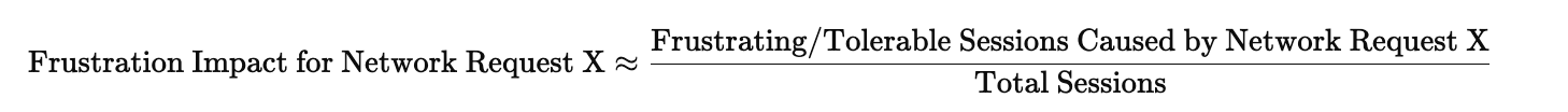 We approximate the percentage of sessions that were frustrating or tolerable due to this particular network request. We calculate this by considering how bad the network request is within all networks, and how much networks are contributing to frustrating and tolerable sessions in total.