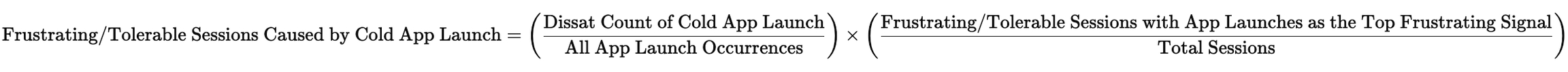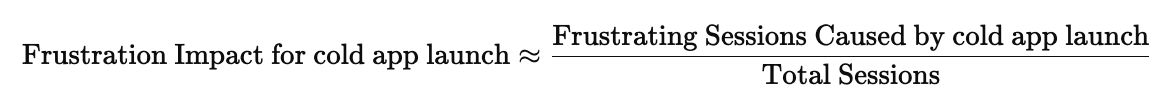 We approximate the percentage of sessions that were frustrating or tolerable due to the cold app launch. We calculate this by considering how bad the cold app launch is within all app launches, and how much app launches contribute to frustrating and tolerable sessions in total.