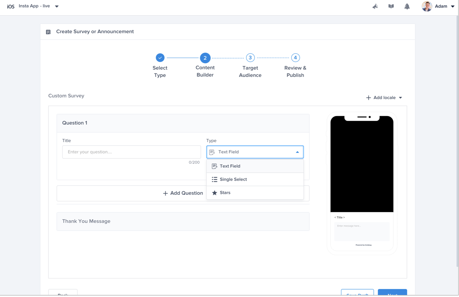 You can choose between three types of surveys when creating a new one: Custom Survey, NPS Survey, and App Rating.