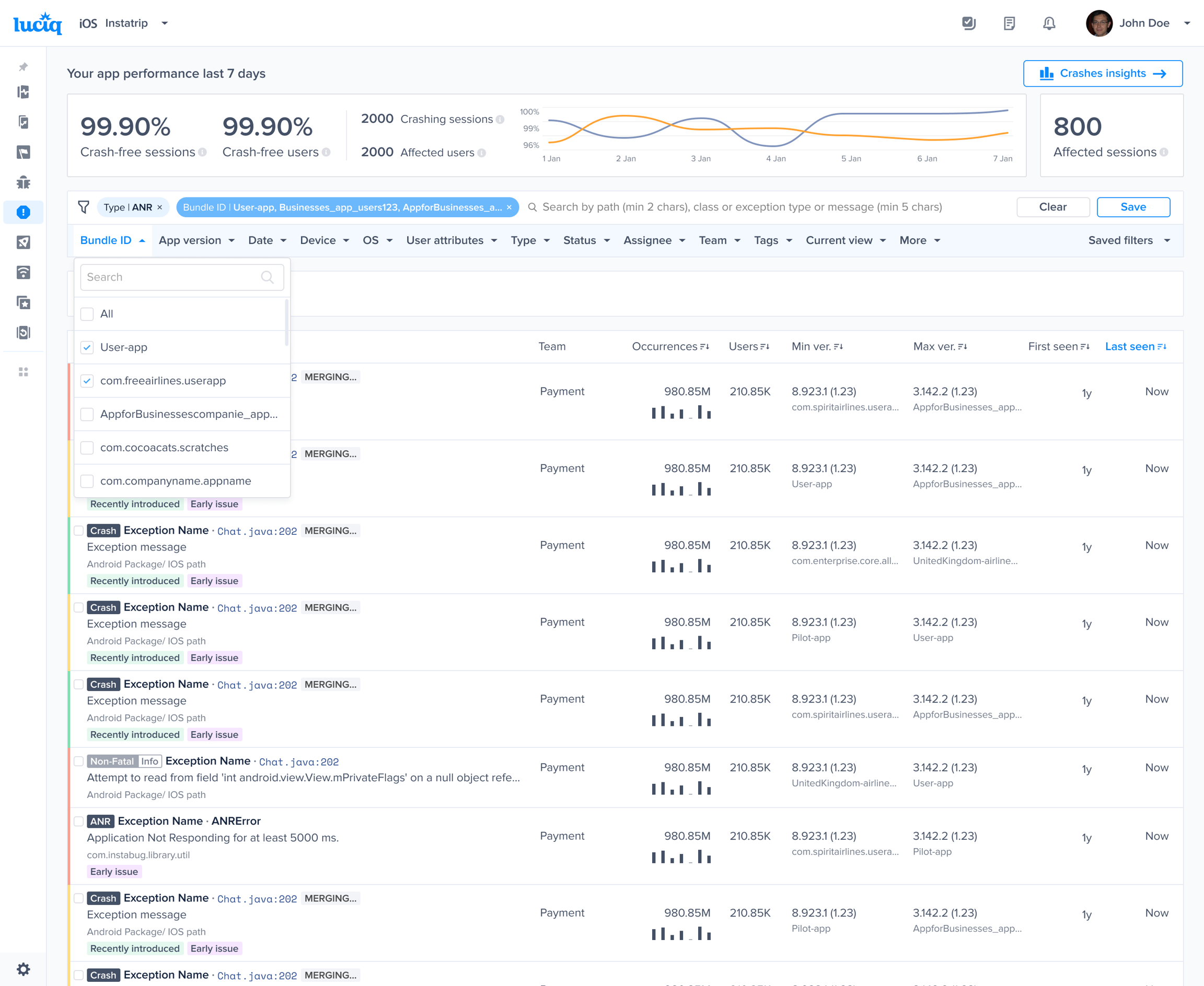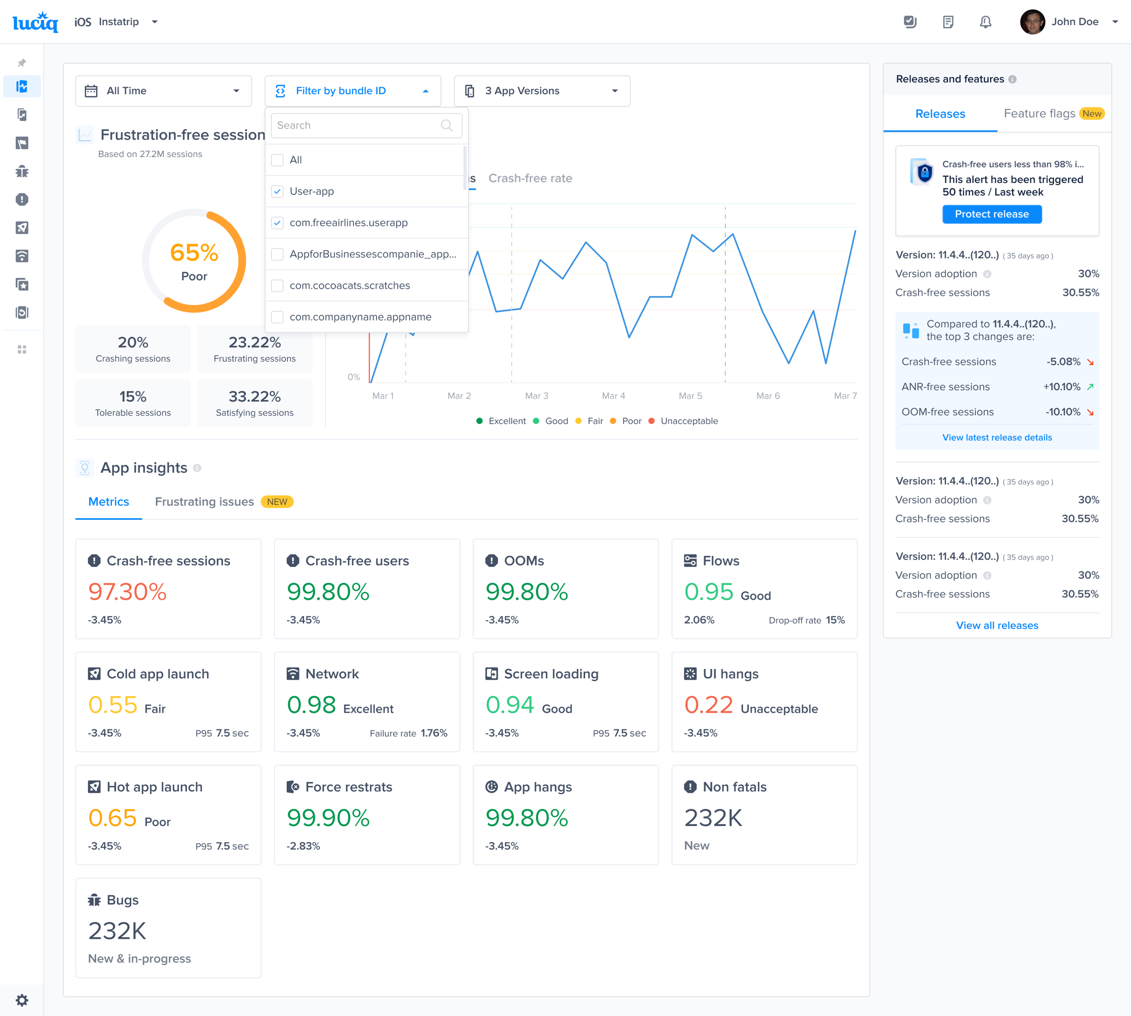 The One Code Apps feature enables teams with shared code base applications to integrate multiple app variants under a single Luciq app token. This is ideal for organizations that release the same app to different brands, markets, or regions but want to consolidate stability and performance monitoring.