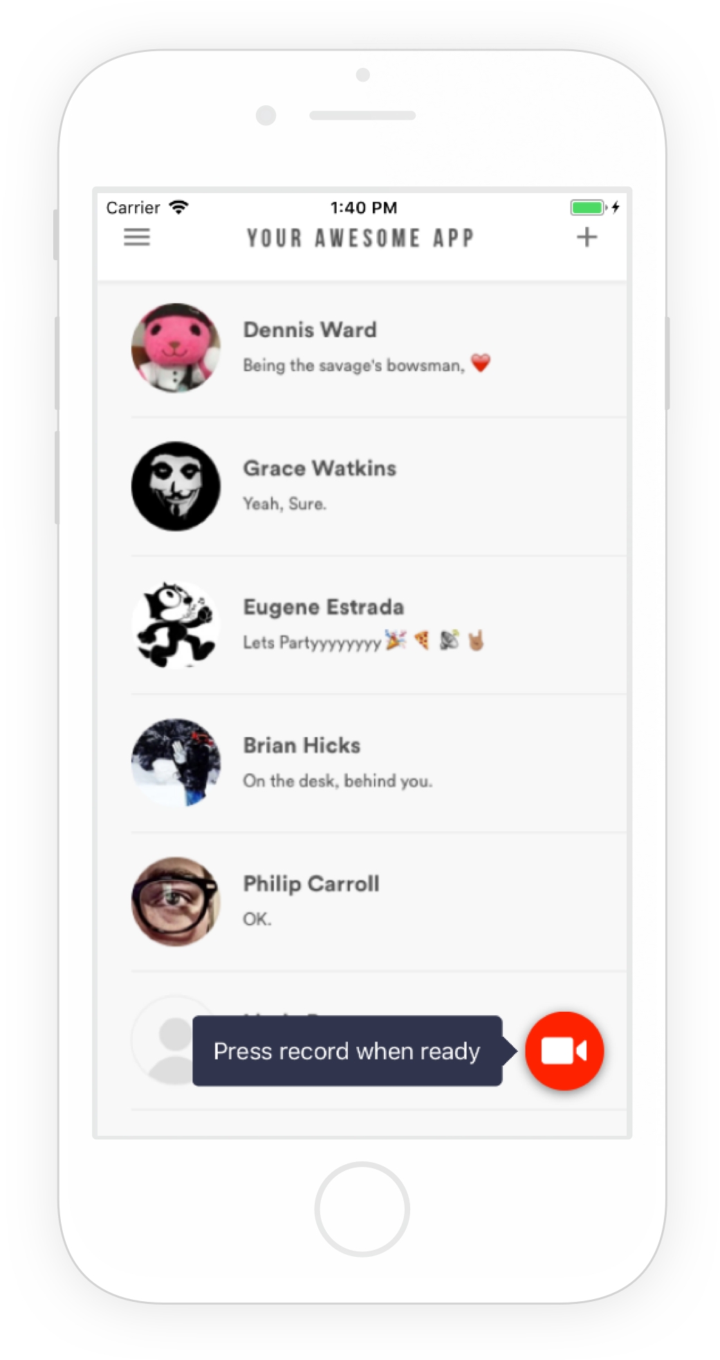 An example of the video recording button placed in the bottom right of an app.