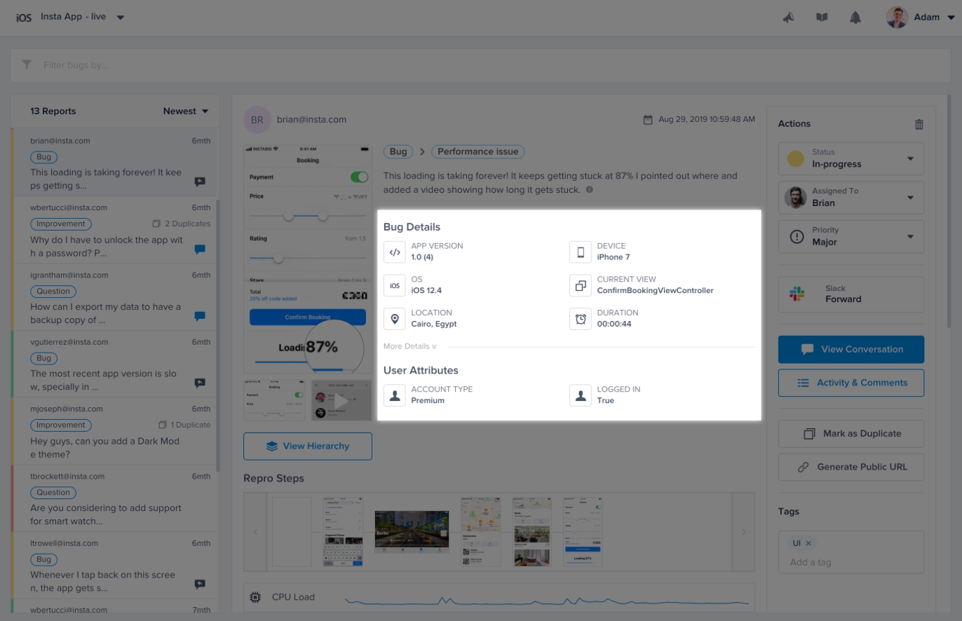 You can assign custom attributes to your users and they will show up on your Luciq dashboard with each report. These attributes can later be used to filter reports in your dashboard.