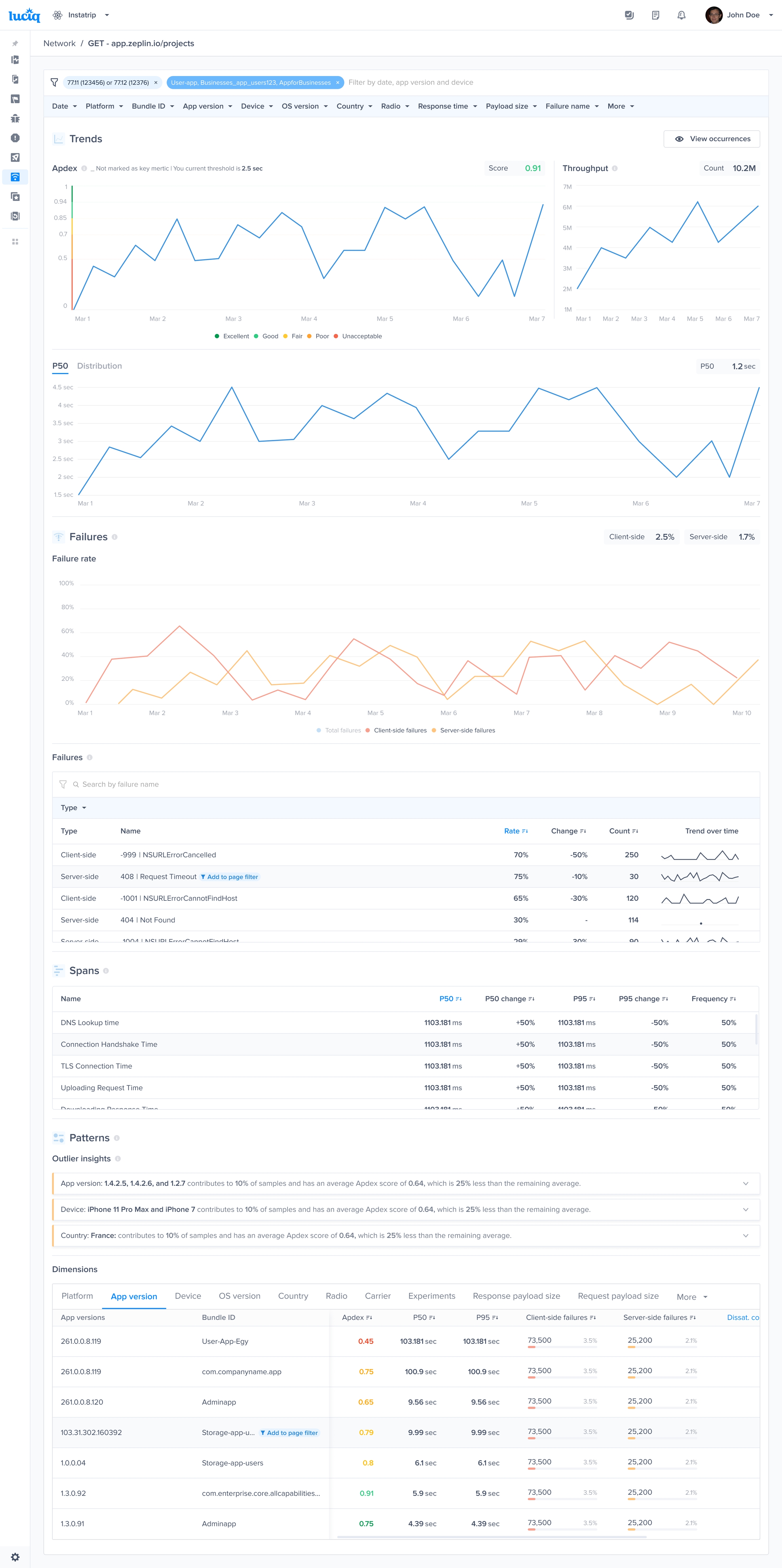 In various dashboard views, bundle IDs (variants) are displayed alongside relevant metrics. In Patterns and dimensions, Variants appear next to the app version so you can spot variant-specific trends.