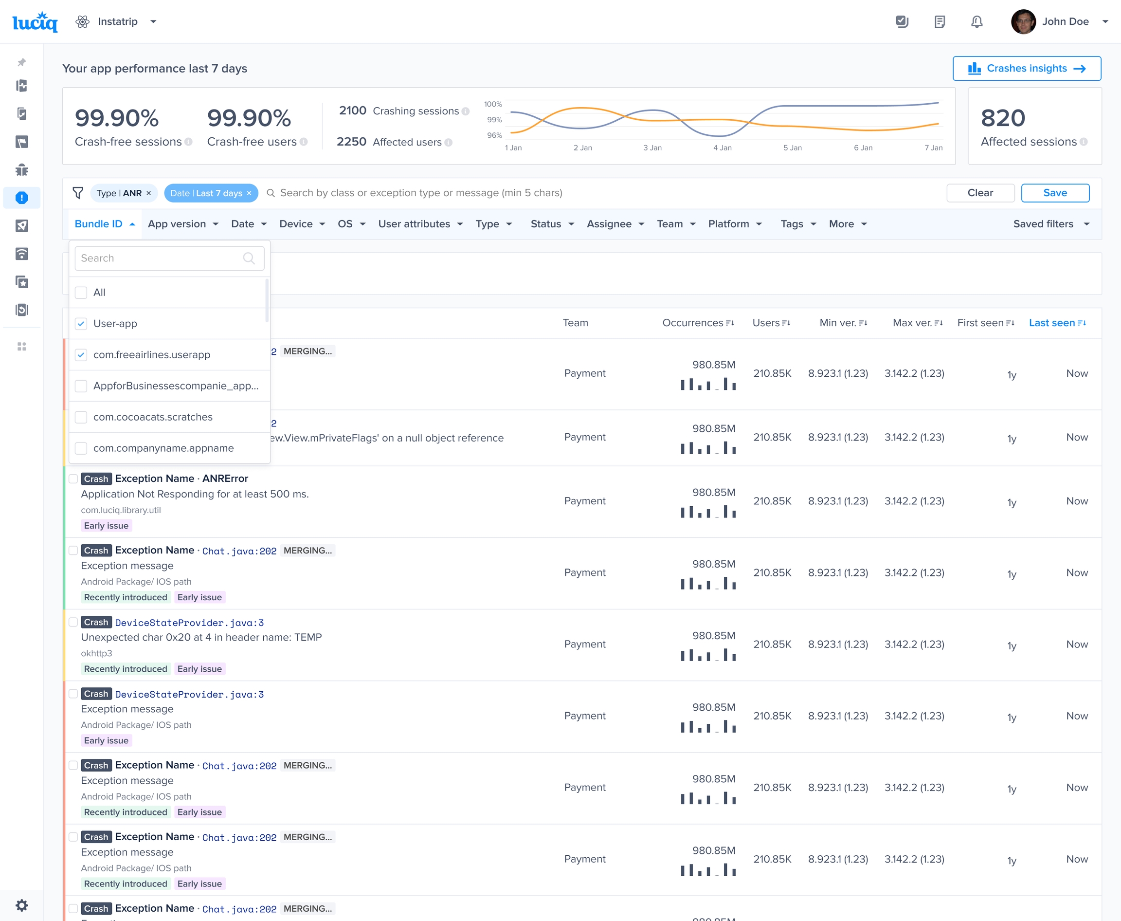 Easily monitor, debug, and manage multiple shared-codebase apps from a single Luciq integration.