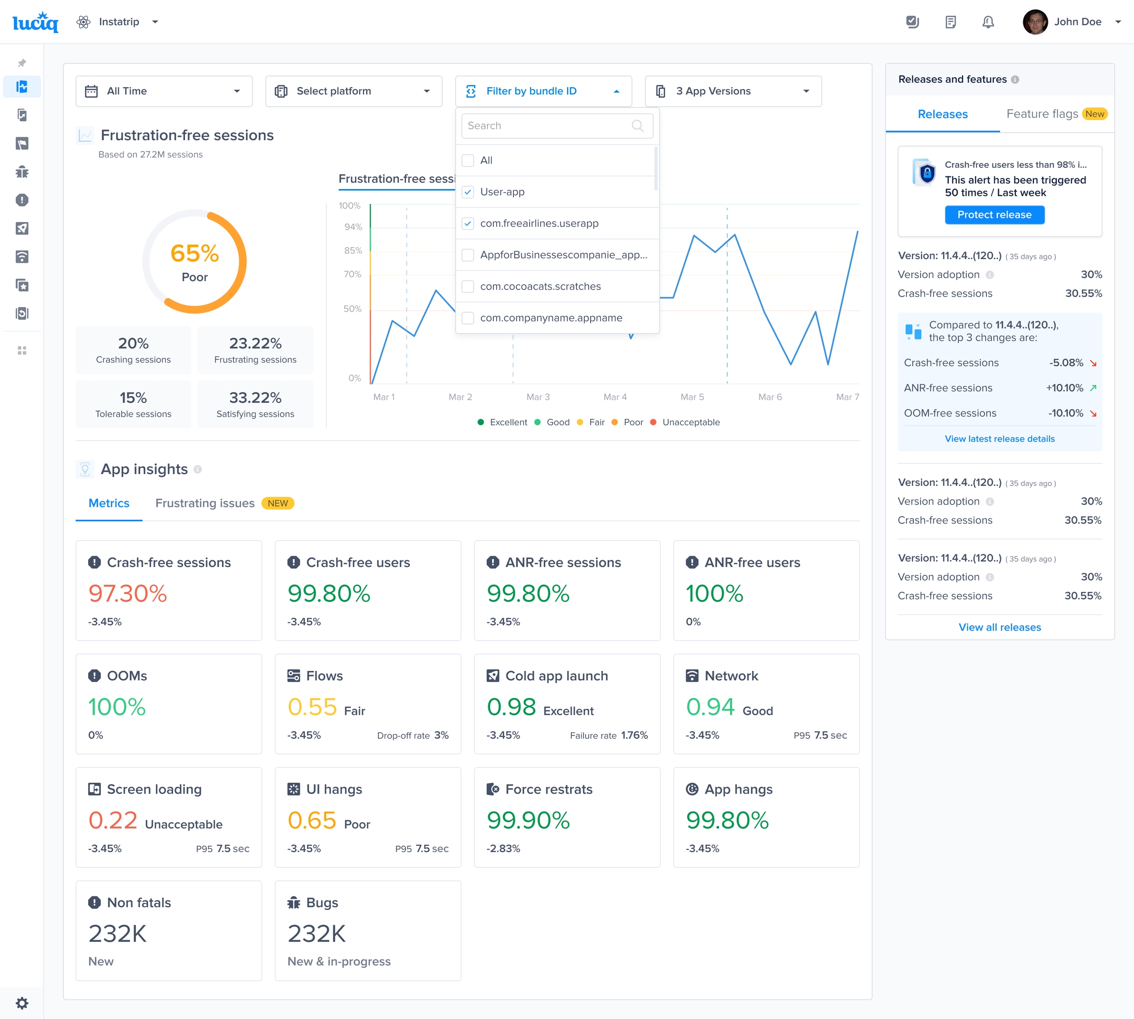 The One Code Apps feature enables teams with shared code base applications to integrate multiple app variants under a single Luciq app token. This is ideal for organizations that release the same app to different brands, markets, or regions but want to consolidate stability and performance monitoring.