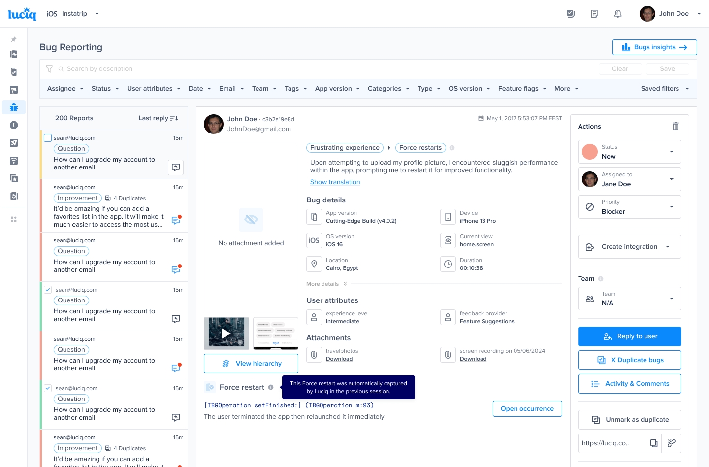 If you have our Force Restart product enabled as part of your plan, users will be prompted to submit their feedback and explain what triggered them to force restart the app.